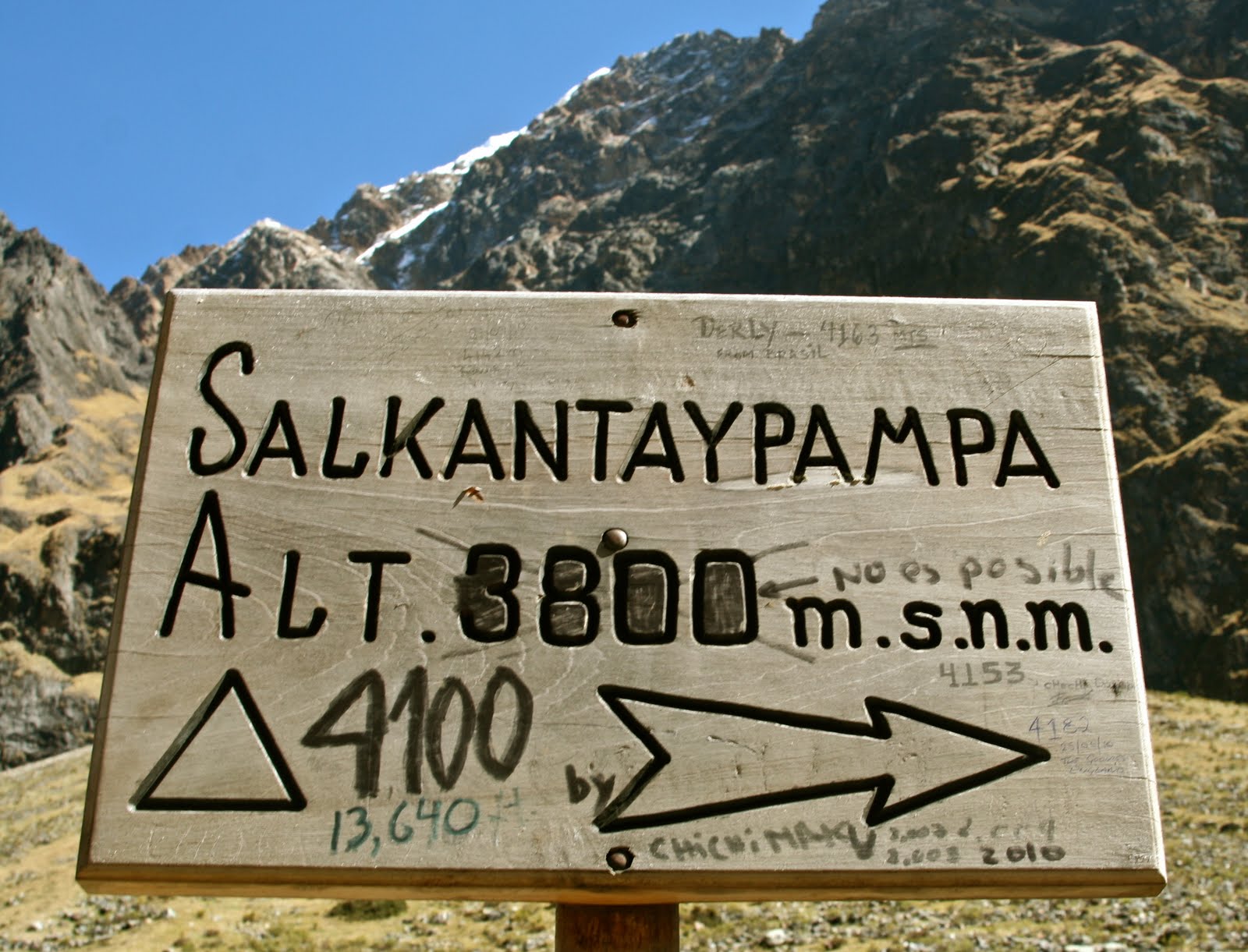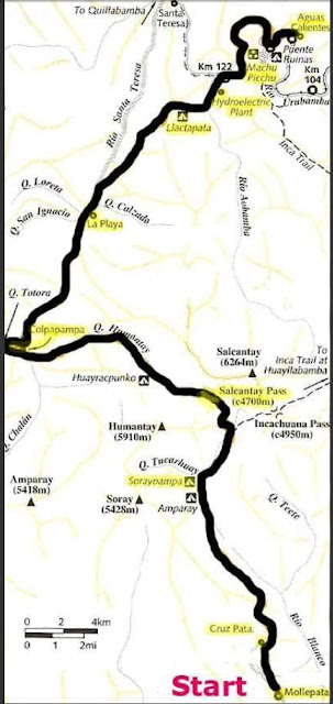 The Salkantay Trail is very easy to follow most of the time. We made it with only having one - "andreantravelweb.com" map (available on the Map page); waiting for passer by's to ask for directions when needed worked pretty well. In this blog I gave detailed descriptions of several places where the trek direction is not obvious.